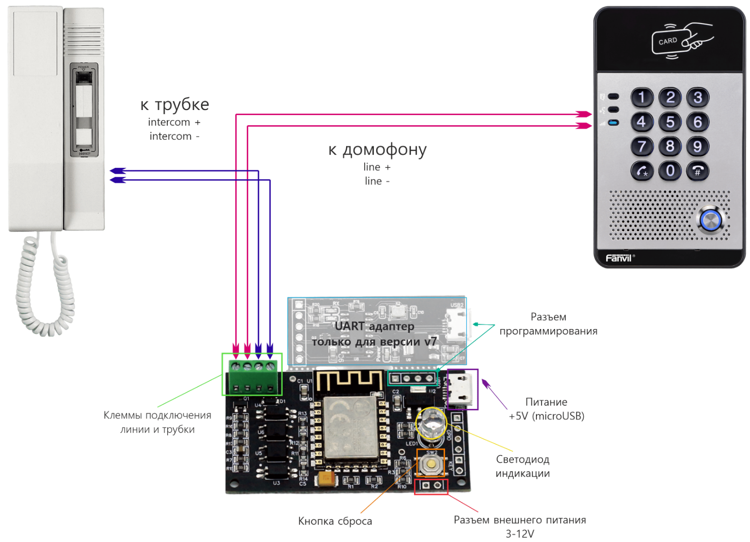 Адаптер для координатного домофона устанавливается в трубку или монтажную коробку в зоне действия домашней сети WiFi, требует подключения питания от USB (MicroUSB) и подведения проводов домофона.