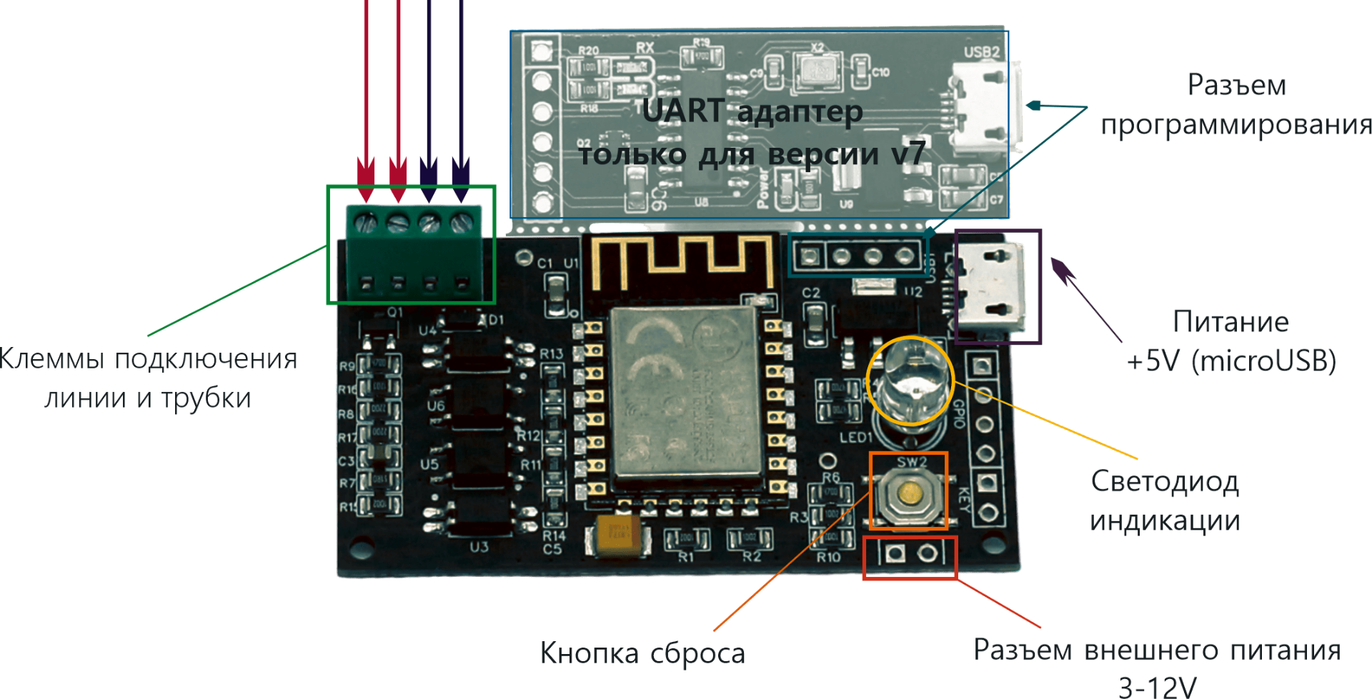 В комплекте имеется дополнительная опцию - встроенный UART адаптер, интегрированный в схему. Он позволяет экспериментировать с устройством, устанавливая разные виды программного обеспечения на модуль. После использования его можно отломить и продолжить использование, сэкономив пространство.
